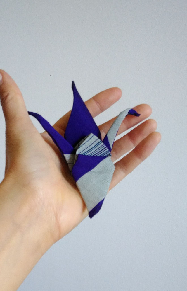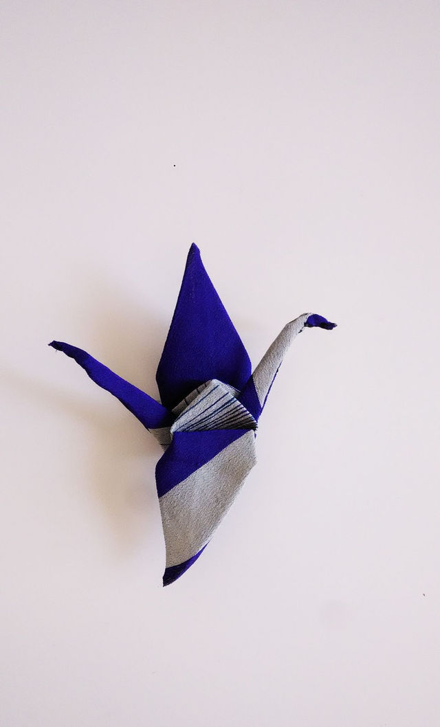 I made a origami crane hair clip brooch with vintage kimono fabric! The fabric is mixtured of silk and rayon. The color is blue violet and gray. It's so lovely clip brooch!!